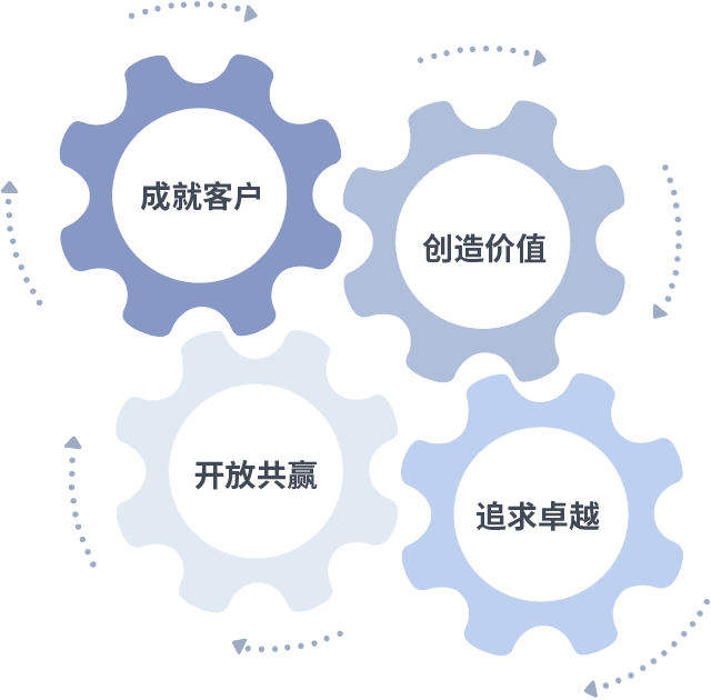 成就客户是一切决策的出发点,,,,创造价值是衡量所有工作的标准,,,追求卓越是我们做事做人的态度,,,开放共赢是我们的格局也是最终的结果。。价值观的齿轮环环相扣,,,,推动着组织里的每个人不断向前。。