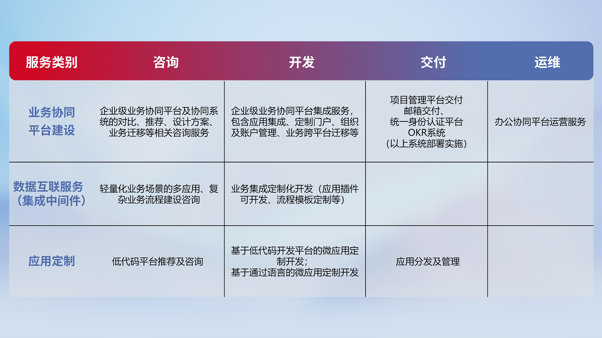 针对钉钉、、企微、、、IDaas等平台级产品提供产品的规划、、、方案、、、交付、、、定制化开发等服务,,,,实现如统一协同办公、、、、智能客户服务、、混合会议管理、、智能数据查询、、等业务场景,,,实现数字化转型。。。。
